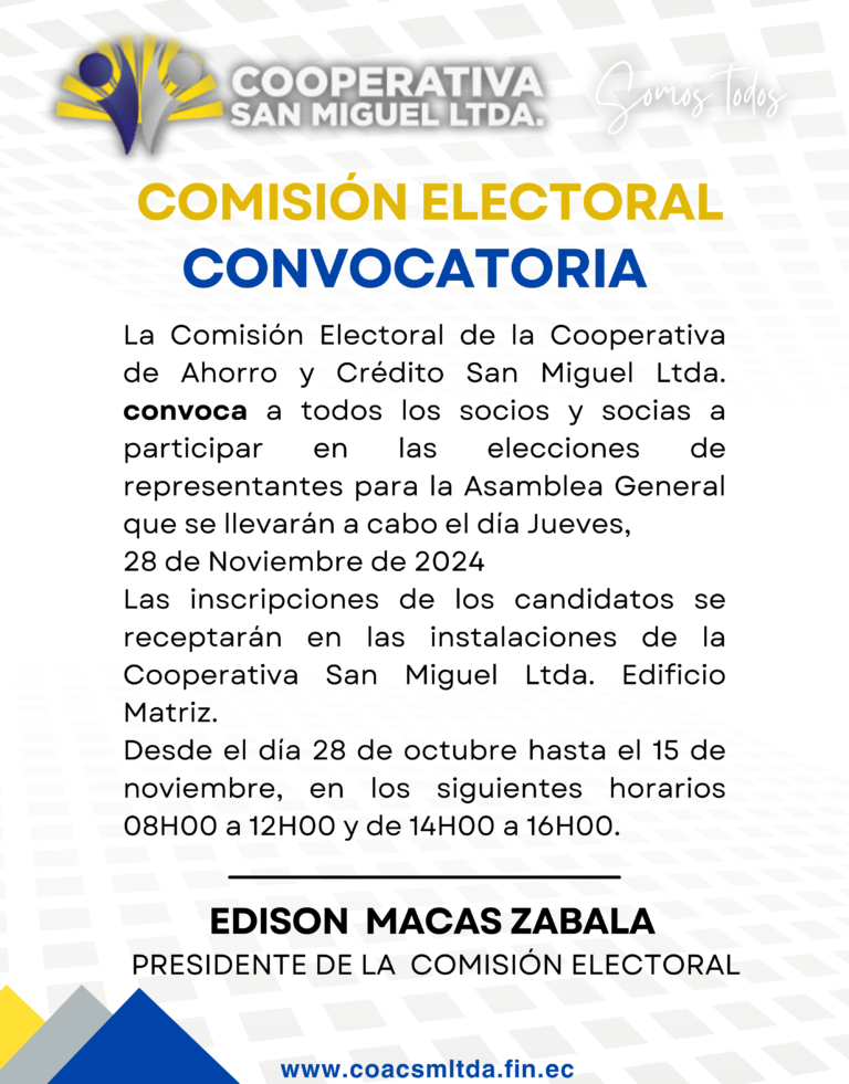 Convocatoria a Elecciones de Representantes para la Asamblea General de la Cooperativa San Miguel Ltda.