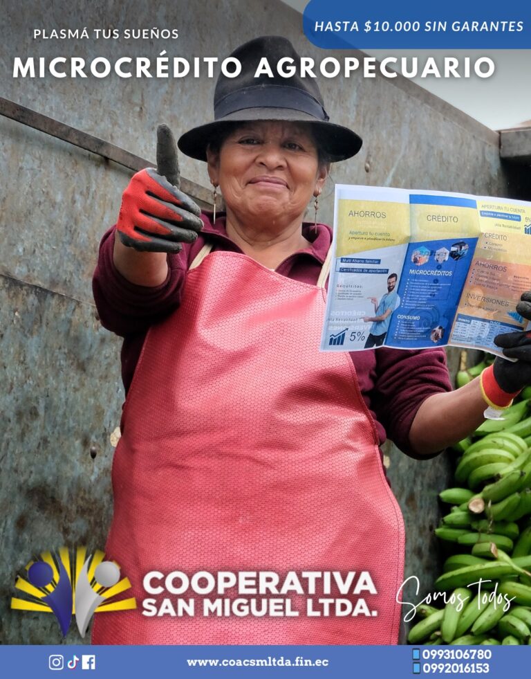 Te presentamos el Microcrédito Agropecuario de la Cooperativa San Miguel Ltda., una solución financiera accesible y eficiente para pequeños y medianos productores agrícolas. Este crédito está diseñado para proporcionar el capital necesario para la compra de insumos, semillas, herramientas y cualquier recurso que impulse tu actividad agropecuaria. Con tasas competitivas y condiciones flexibles, nuestro microcrédito te permite mejorar y expandir tu producción. ¡Confía en la Cooperativa San Miguel Ltda.! y lleva tu emprendimiento agrícola al siguiente nivel!